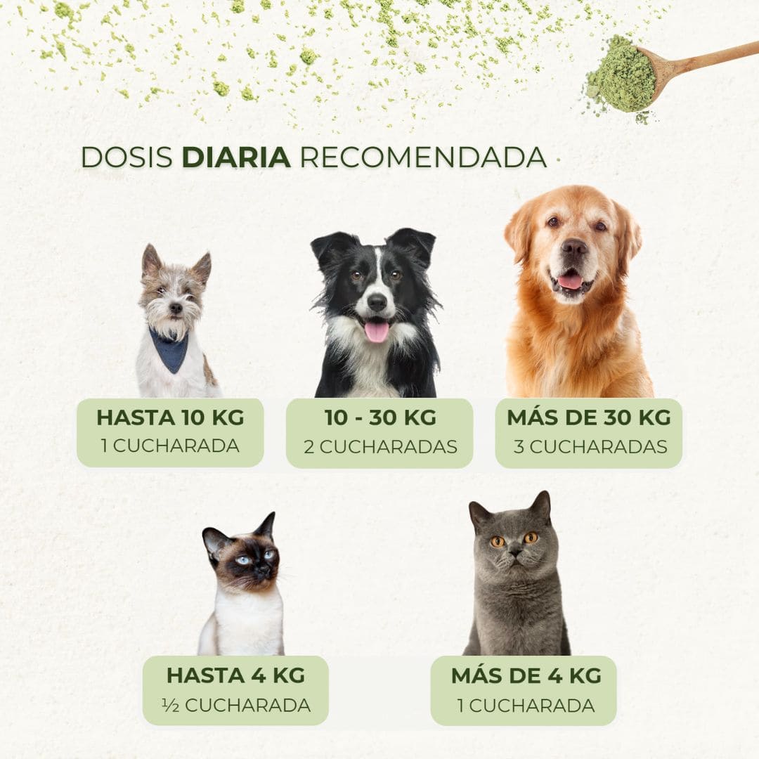 Solo debes espolvorear la cantidad recomendada sobre su comida una vez al día. No cambia el sabor ni el olor, por lo que tu mascota lo tomará sin problema.